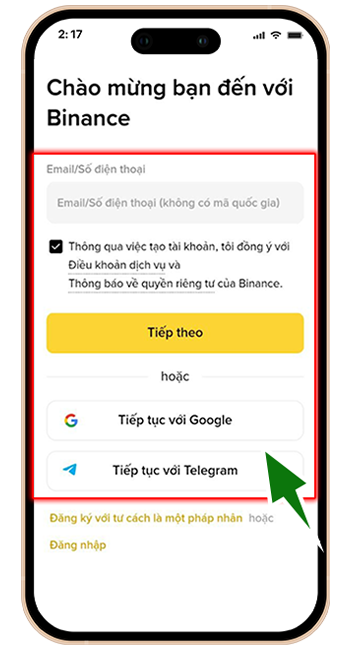BƯỚC 1: NHẬP SỐ ĐIỆN THOẠI, EMAIL TÀI KHOẢN APPLE, GOOGLE HOẶC TELEGRAM ĐỂ ĐĂNG KÝ, VÀ DÙNG LẠI THÔNG TIN ĐỂ ĐĂNG NHẬP BINANCE → CHỌN [TIẾP THEO].