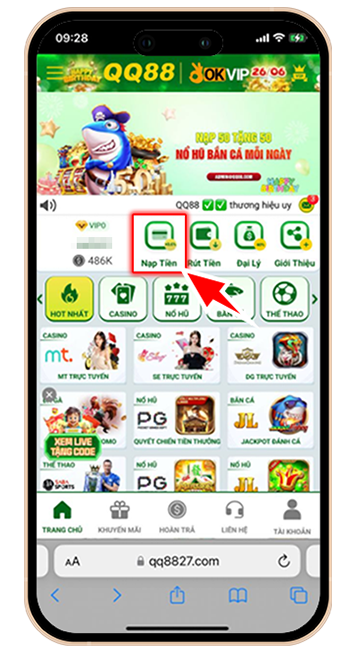 BƯỚC 1: TẠI TRANG CHỦ QQ88 → CHỌN MỤC 'NẠP TIỀN'.