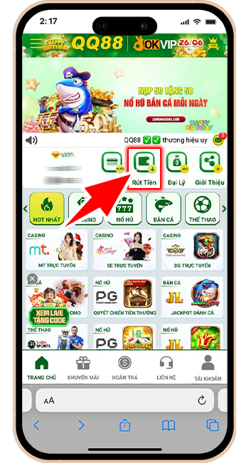 BƯỚC 1: TẠI TRANG CHỦ QQ88, CHỌN MỤC "RÚT TIỀN"